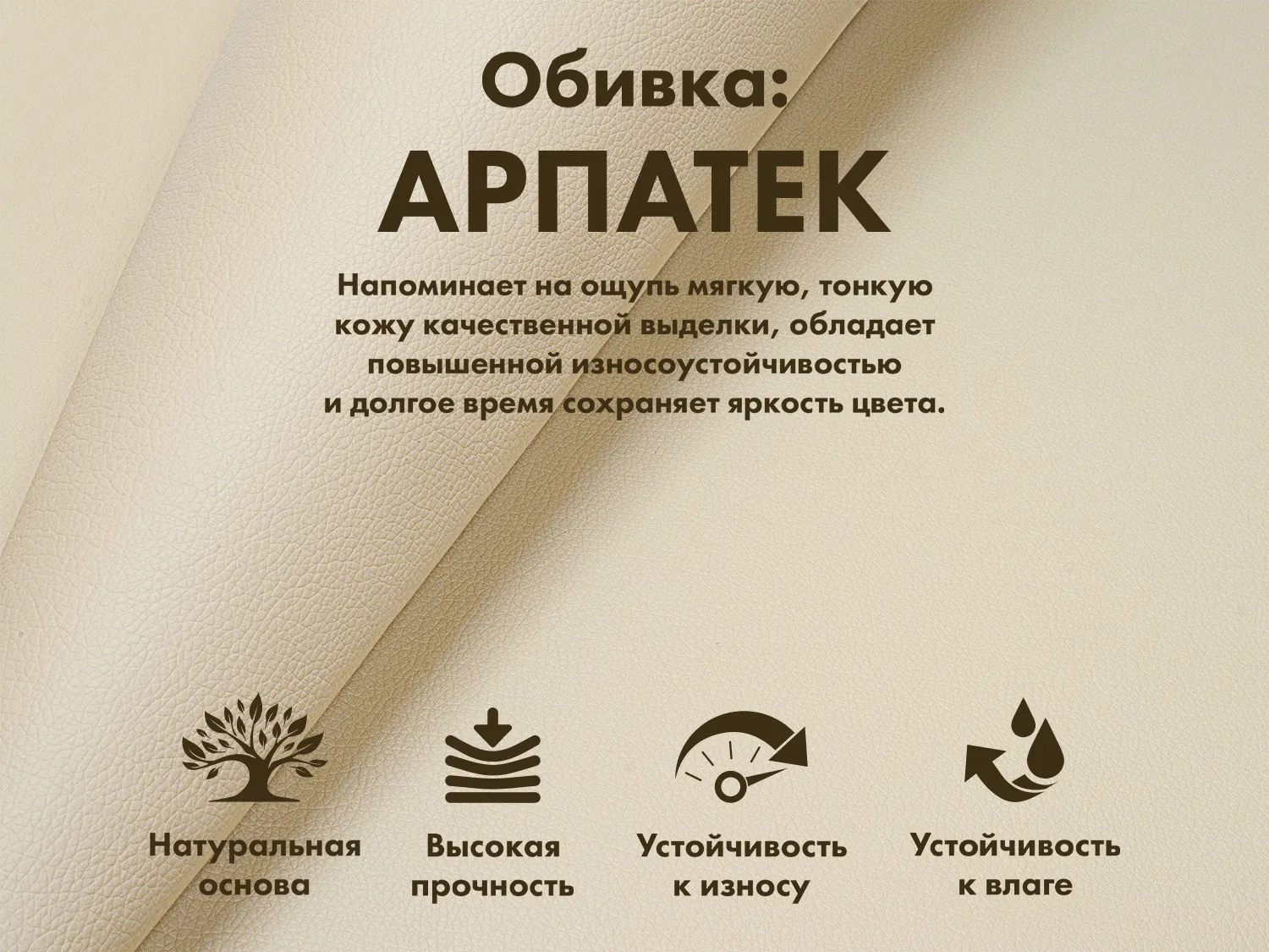 Кресло обтянуто тканью АРПАТЕК – приятной на ощупь, с благородной текстурой, как у натуральной кожи. Материал отличается особой износостойкостью и не выцветает со временем.