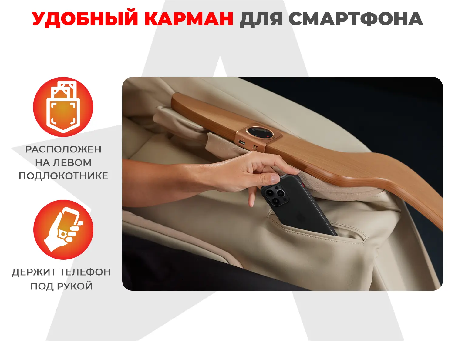 Удобный карман на левом подлокотнике позволит всегда держать телефон под рукой во время массажного сеанса.