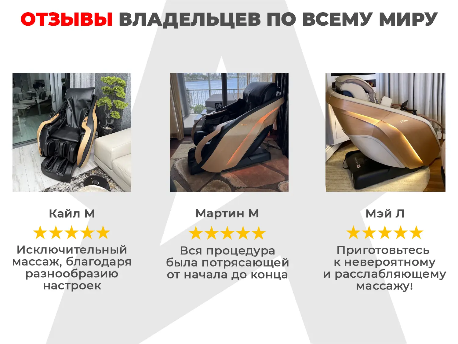 Для домашнего использования, Избавление от боли в спине, Кресла для больших людей, Повышение иммунитета, Повышение производительности, Снижение стресса, Увеличение подвижности и гибкости, Укрепление сердечно-сосудистой системы, Улучшение самочувствия, Улучшение сна, Уменьшение головной боли |