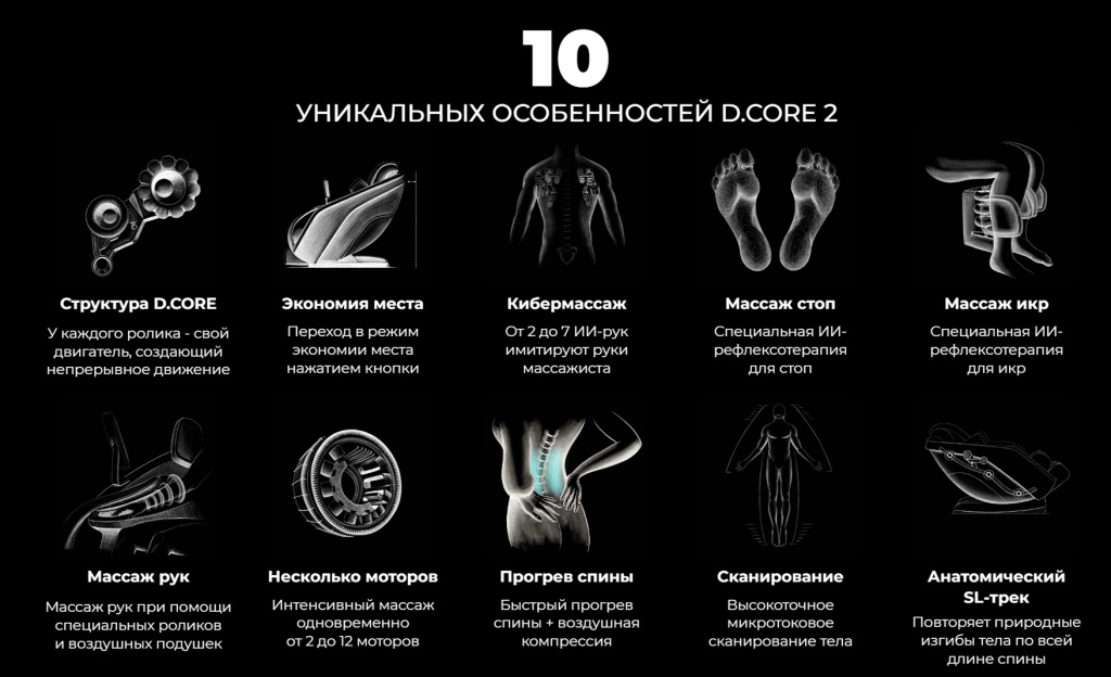 Уникальное устройство массажных роликов в D.CORE 2 позволяет им воздействовать на глубокие слои мышц, устраняя ощущение напряжения и скованности в теле: это запатентованная технология 3D+ TrueShiatsu Action, доступная только в этой линейке массажных кресел.